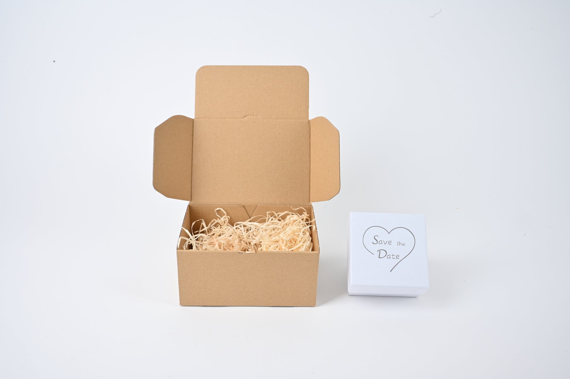 Die Bestellung (10,95 Euro) beinhaltet eine personalisierte weiße Save the Date Box inklusive einem Glückskeks, die wir mit Holzwolle natur ausgepolstert in einem Kleinpaket mit DHL versenden.