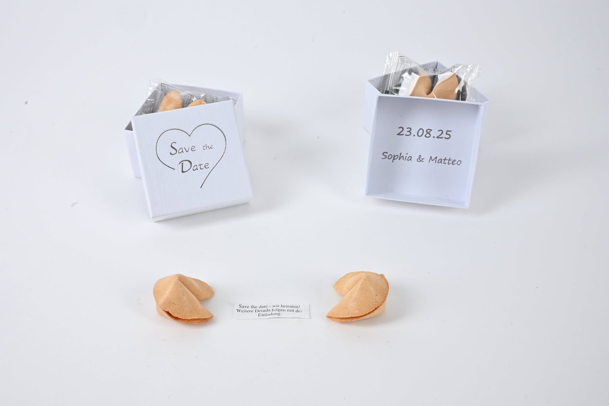 7,50 Euro ist der Preis für eine Save the Date Box inklusive einem Glückskeks und Personalisierung (Namen und Datum).